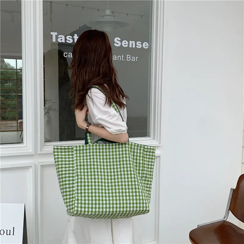 Women Casual Design Plaid Pattern Canvas Large Capacity Shoulder Handle Tote Bag